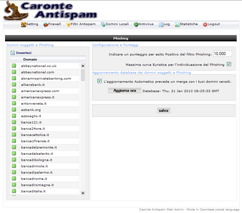 It's possible to enable the automatic update of the databases with the relative control schemes and insert eventual domains subjects to phishing escaped from this feature of Caronte Antispam.